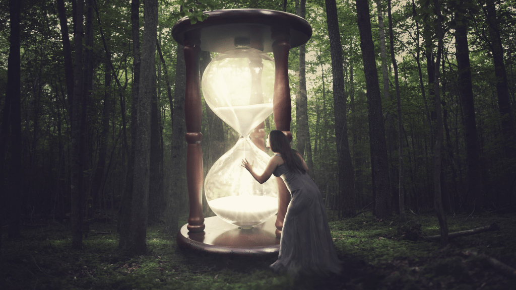 Reloj de arena, cuaderno en blanco; terreno baldío;