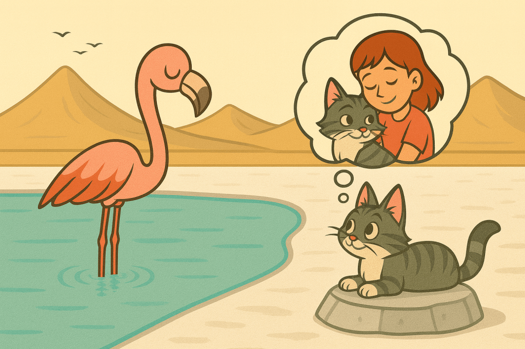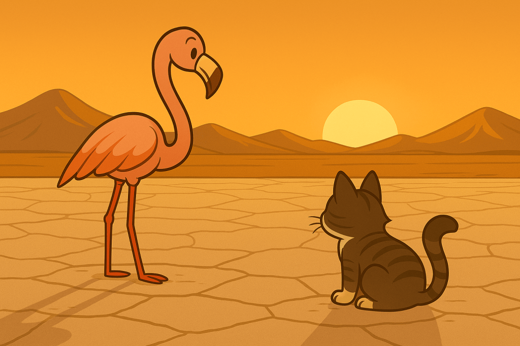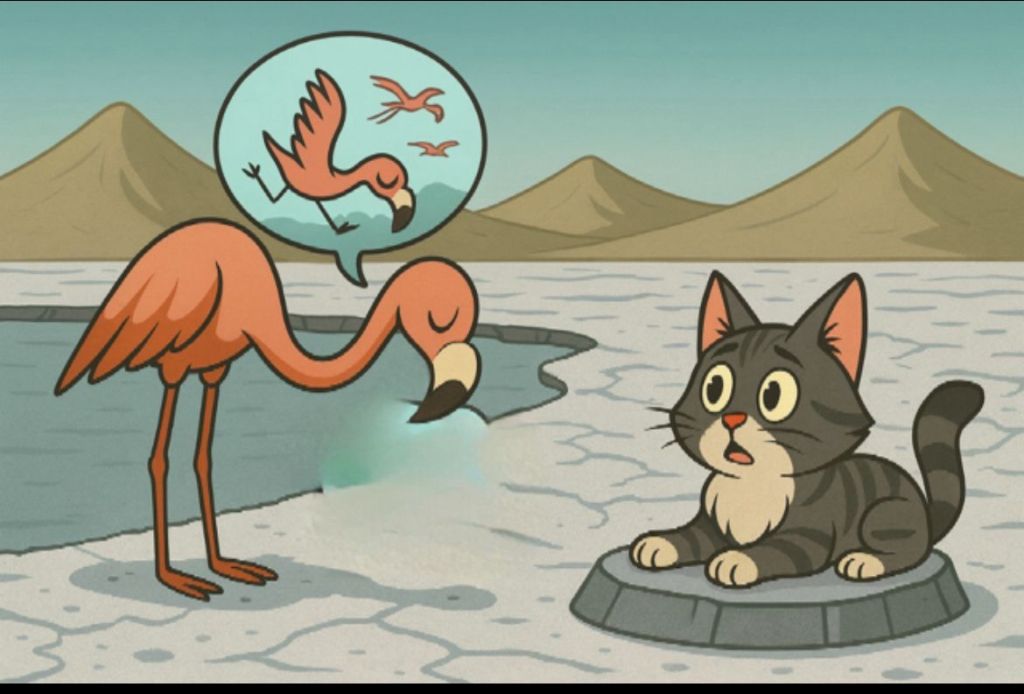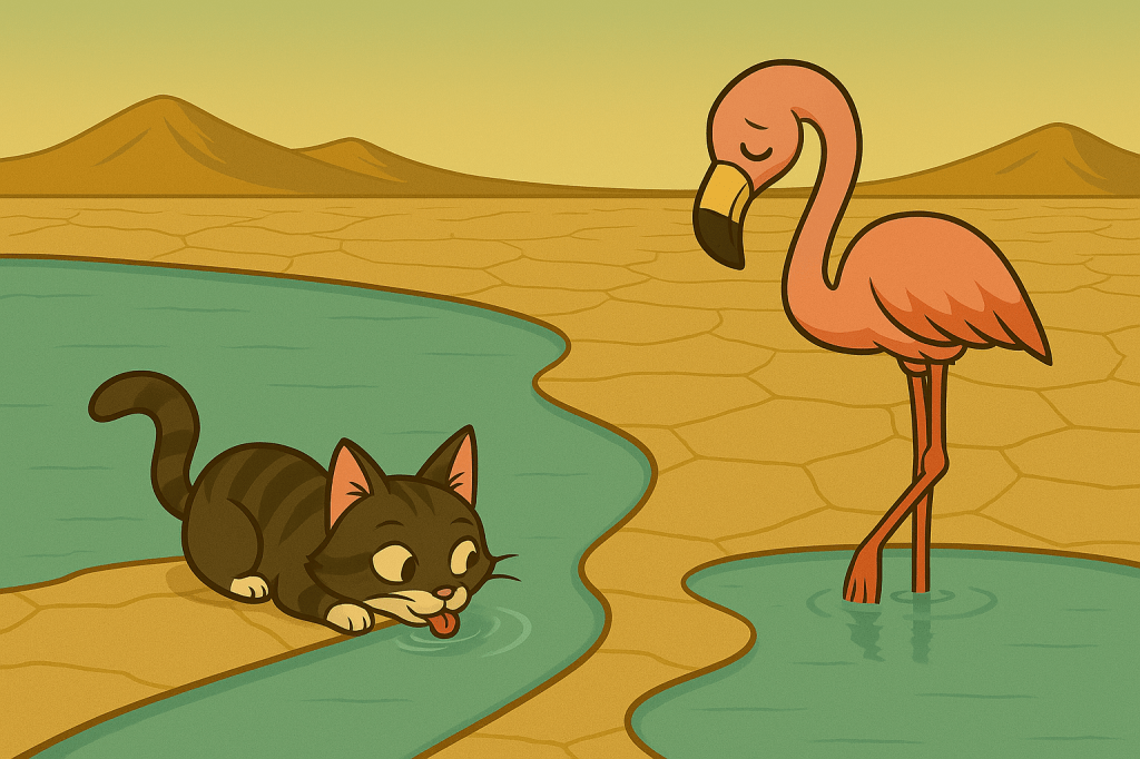 El ave escuchó el sonido del Gato bebiendo. Giró el cuello con cautela. El felino, sin apartar la vista del agua, lamió una última vez, se acomodó sobre una roca cercana y miro al Flamenco sin decir nada. Sabía cuándo un ser no necesitaba palabras, sino compañía.