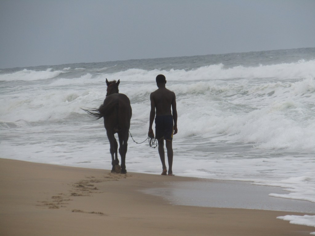 Al salir del museo y caminar hacia la costa, el paisaje cambia y aparece el océano Atlántico. La playa se extiende infinita hacia el horizonte. Las olas rompen con toda su fuerza. Desde la costa se observan estructuras coloniales en ruinas que conviven junto a casas habitadas, y la vida cotidiana se mezcla con los restos del pasado.