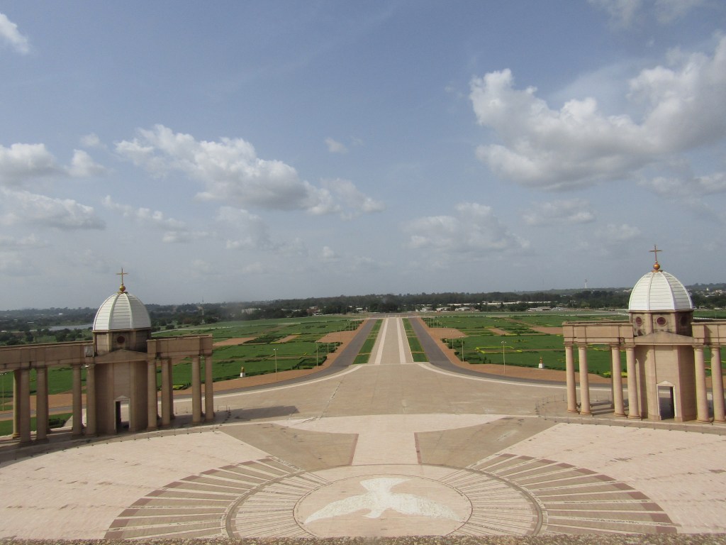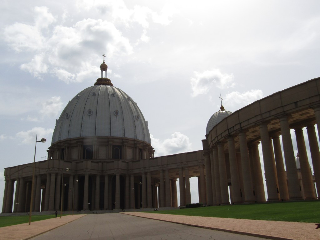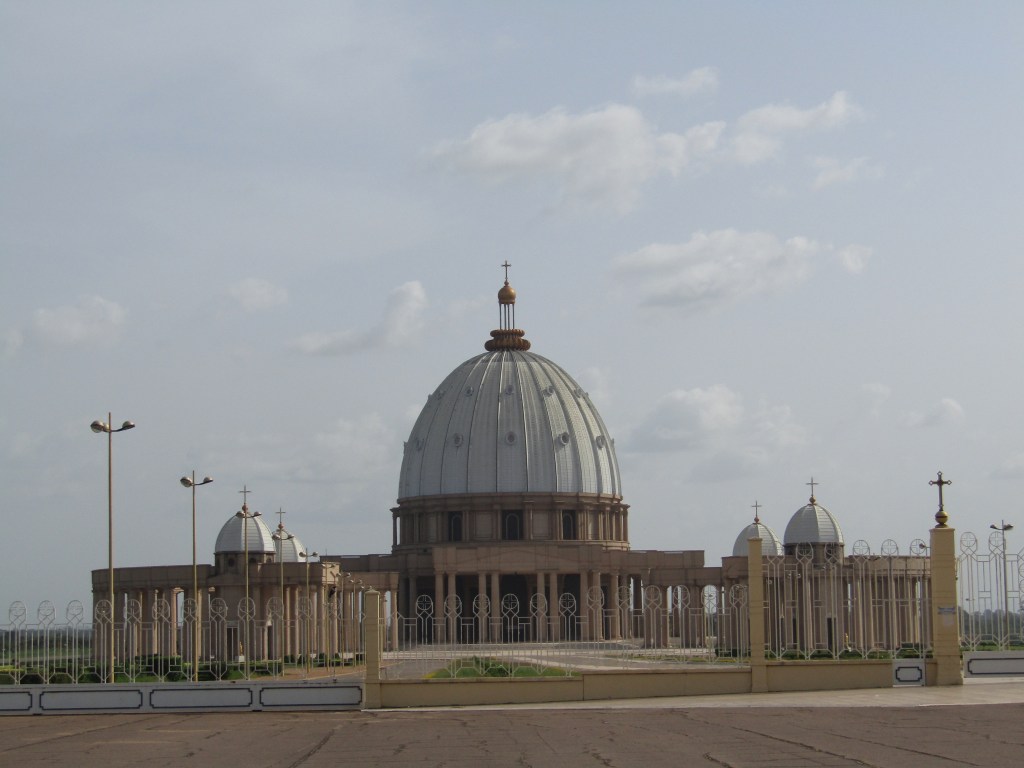 Imponente, desproporcionada y, para muchos, desconcertante. Inspirada claramente en la Basílica de San Pedro del Vaticano, esta construcción —erigida a fines del siglo XX por el entonces presidente Félix Houphouët-Boigny— se alza en medio de un paisaje que poco tiene que ver con Roma.